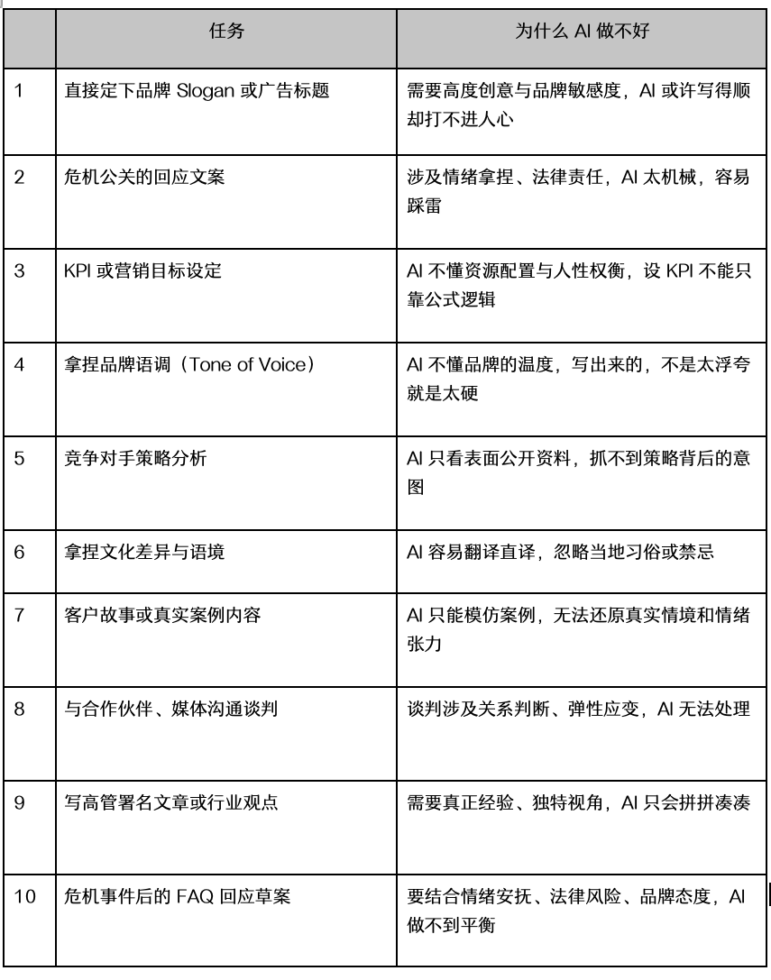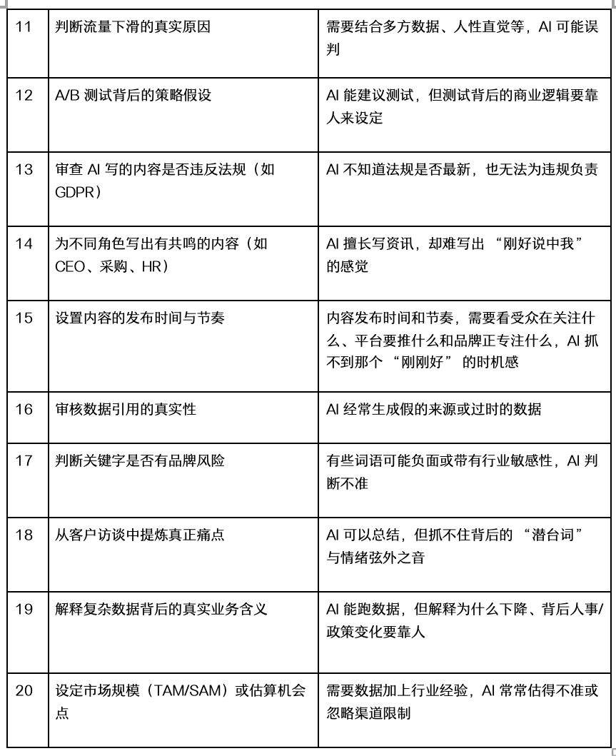 在这里,我筛选了 20 个最关键的营销任务,整理成一个列表来讲述这些任务为何不能让 AI 单独处理,来看看!