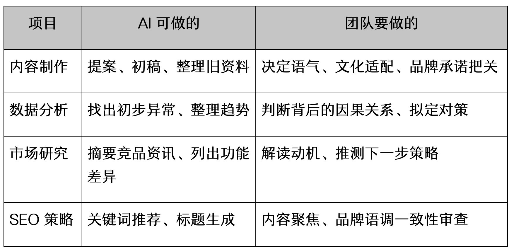 你会发现,AI 负责的是 “大量的执行”,但真正影响品牌走向的,是人脑的判断。