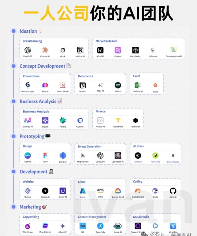 最近,我看到有个整理图,很有前瞻性地揭示,若善用 AI ,就可以成为一个很精悍的小团队,因为 AI 已经可以覆盖从创意、开发、行销到客服的所有环节。