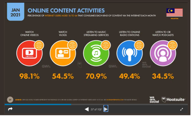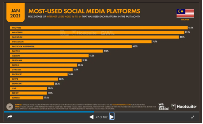 根据 Digital 2021 Malaysia 报导 – 马来西亚用户依然以 Facebook 用户成为主流社群媒体(图一),但用户开始搜索及消化内容的习性已趋向短视频(图二),接下来,用户是否会移情别恋,让TIKTOK 渠道弯道超车,绝对不是你和我说了算,而是必须依赖品牌方,用户端的双向推动,才可能形成新一股的营销动向。